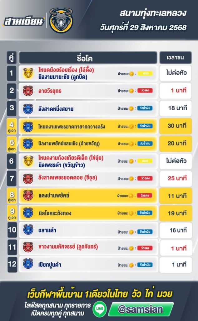 สรุปผล สนามชนโคทุ่งทะเลหลวง วันที่29 สิงหาคม 2568