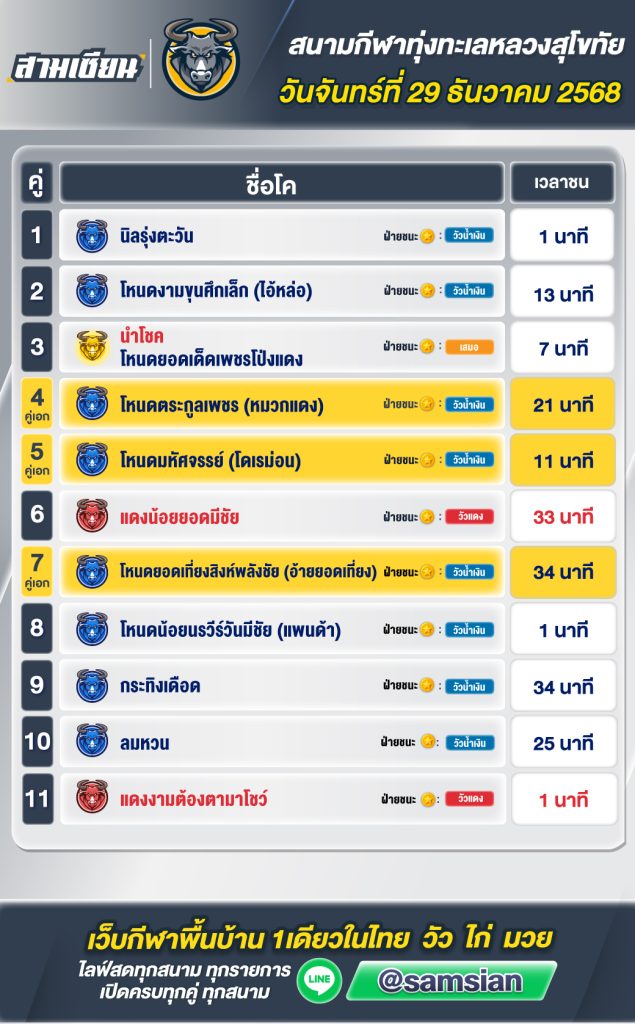 สรุปผล สนามชนโคทุ่งทะเลหลวง วันที่29 พฤศจิกายน 2568