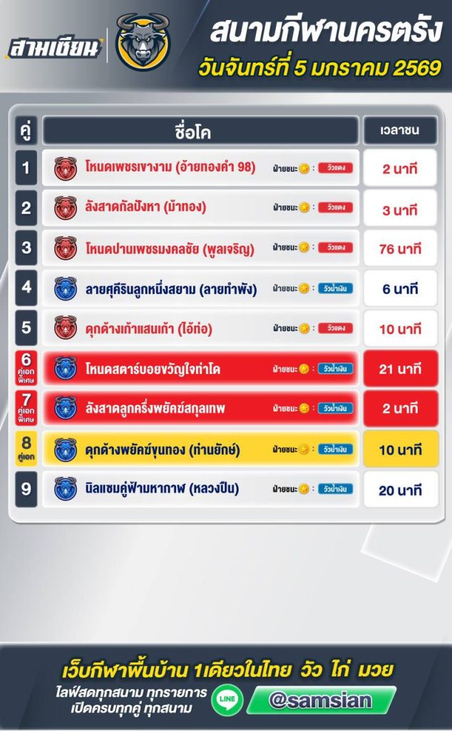 สรุปผล สนามชนโคนครตรัง วันที่5 มกราคม 2569