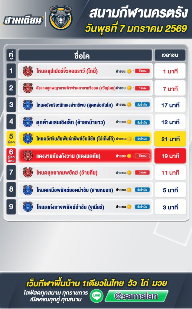 สรุปผล สนามชนโคนครตรัง วันที่7 มกราคม 2569