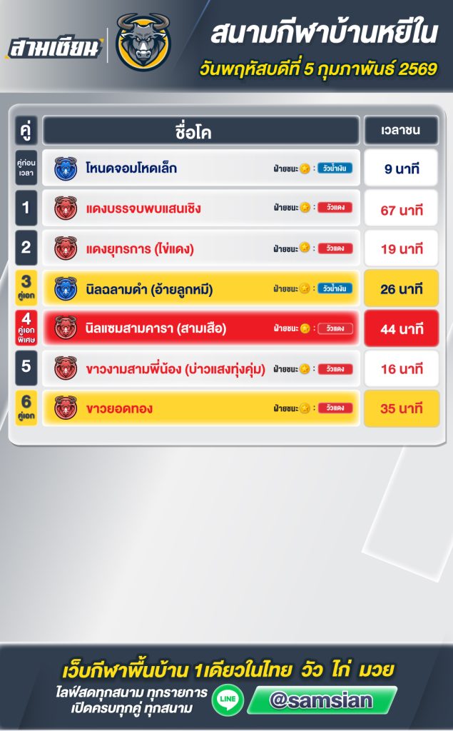 สรุปผล สนามชนโคหยีใน วันที่5 กุมภาพันธ์ 2569