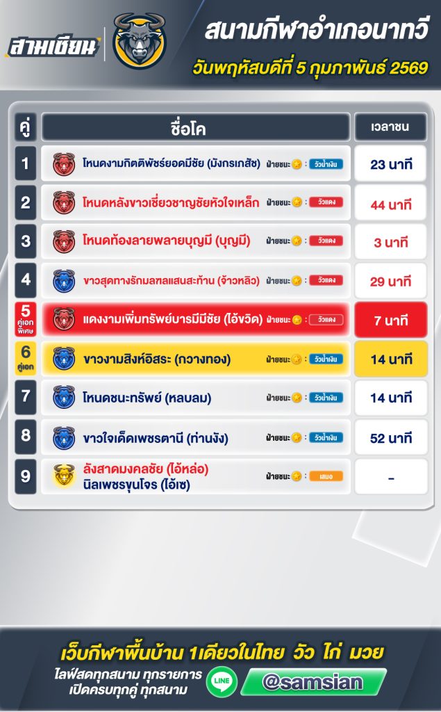 สรุปผล สนามชนโคนาทวี วันที่5 กุมภาพันธ์ 2569