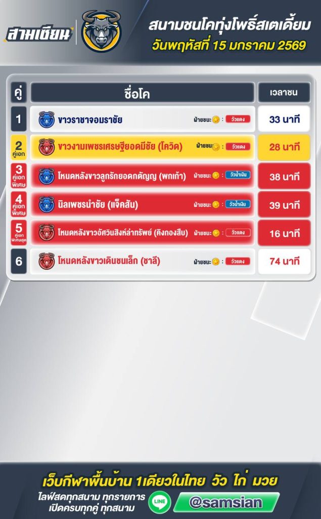 สรุปผล สนามชนโคบ้านทุ่งโพธิ์ วันที่15 มกราคม 2569