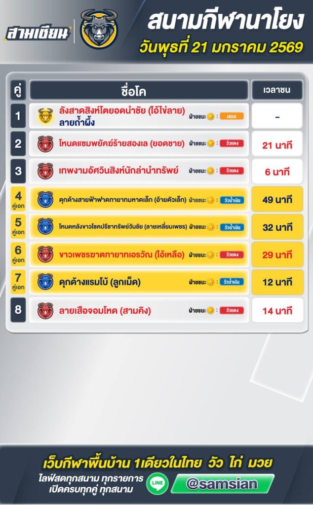 สรุปผล สนามชนโคบ้านนาโยง วันที่21 มกราคม 2569