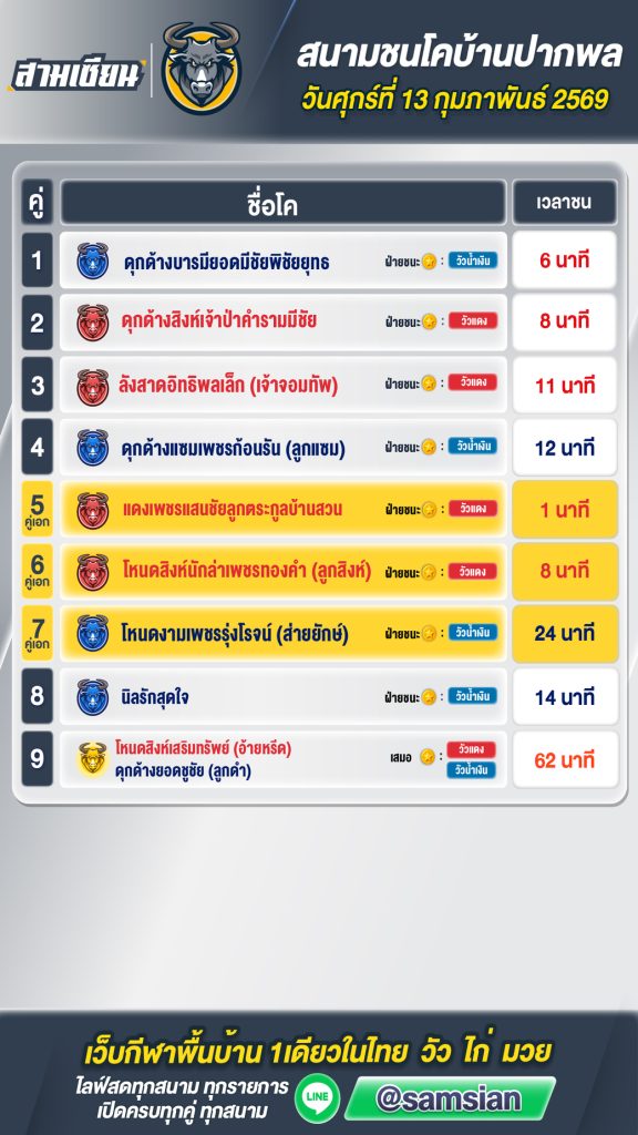 สรุปผล สนามชนโคปากพล วันที่13 กุมภาพันธ์ 2569