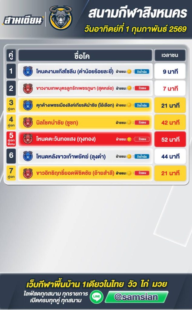 สรุปผล สนามชนโคสิงหนคร วันที่1 กุมภาพันธ์ 2569