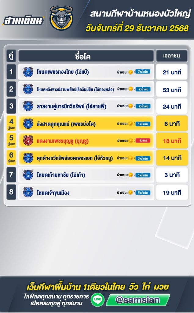 สรุปผล สนามชนโคหนองบัวใหญ่ วันที่29 พฤศจิกายน 2568