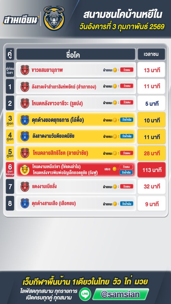 สรุปผล สนามชนโคหยีใน วันที่3 กุมภาพันธ์ 2569