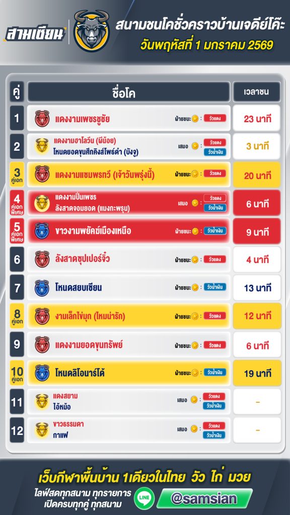สรุปผล สนามชนโคเจดีย์โค๊ะ วันที่1 มกราคม 2569