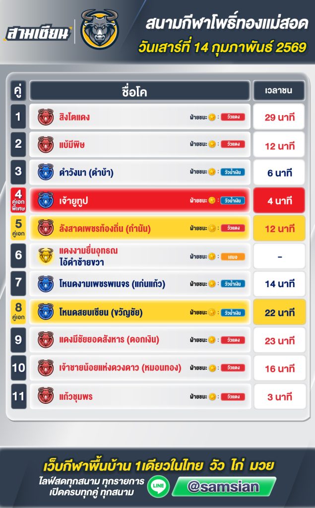 สรุปผล สนามชนโคโพธิ์ทอง วันที่14 กุมภาพันธ์ 2569