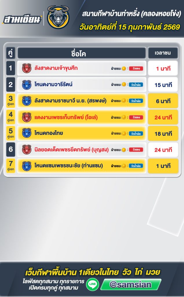 สรุปวัวชน สนามกีฬาชนโคท่าหรั่ง วันที่ 15 กุมภาพันธ์ 2569