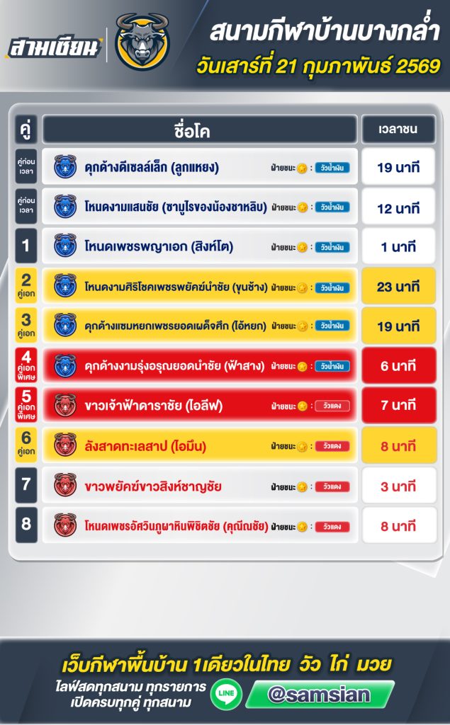 สรุปวัวชน สนามกีฬาชนโคบางกล่ำ วันที่ 21 กุมภาพันธ์ 2569
