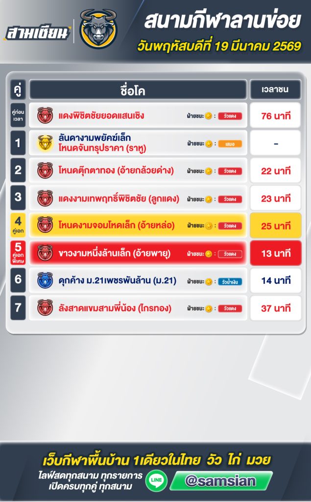 สรุปวัวชน สนามกีฬาชนโคลานข่อย วันที่ 19 มีนาคม 2569