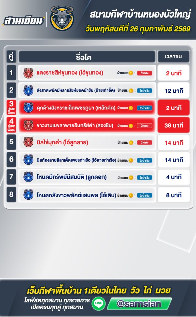 สรุปวัวชน สนามกีฬาชนโคหนองบัวใหญ่ วันที่ 26 กุมภาพันธ์ 2569