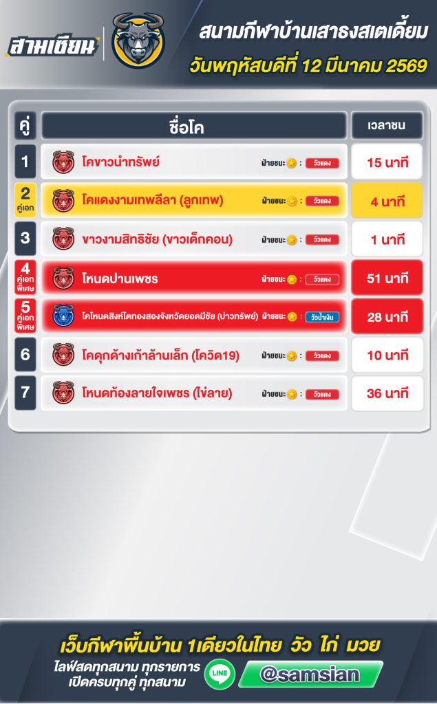 สรุปวัวชน สนามกีฬาชนโคเสาธง วันที่ 12 มีนาคม 2569