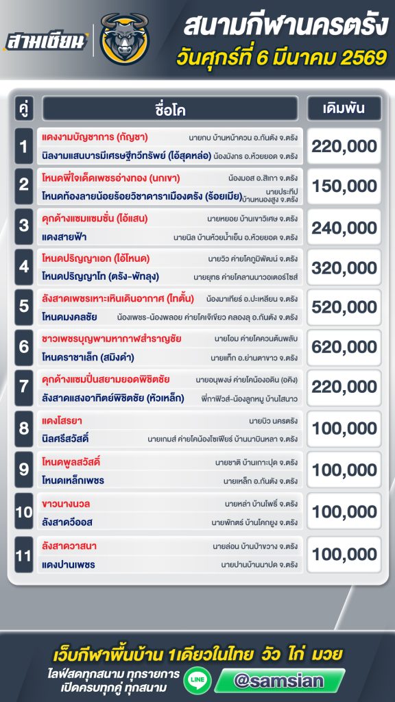 โปรแกรมวัวชน สนามกีฬาชนโคนครตรัง วันที่ 6 มีนาคม 2569