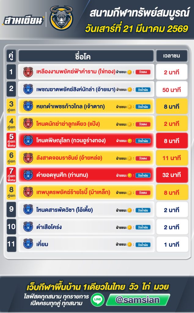 สรุปวัวชน สนามกีฬาชนโคทรัพย์สมบูรณ์ วันที่ 21 มีนาคม 2569