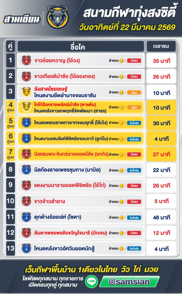สรุปวัวชน สนามกีฬาชนโคทุ่งสง วันที่ 22 มีนาคม 2569