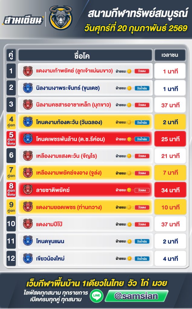 สรุปวัวชน สนามกีฬาชนโคทรัพย์สมบูรณ์ วันที่ 20 กุมภาพันธ์ 2569