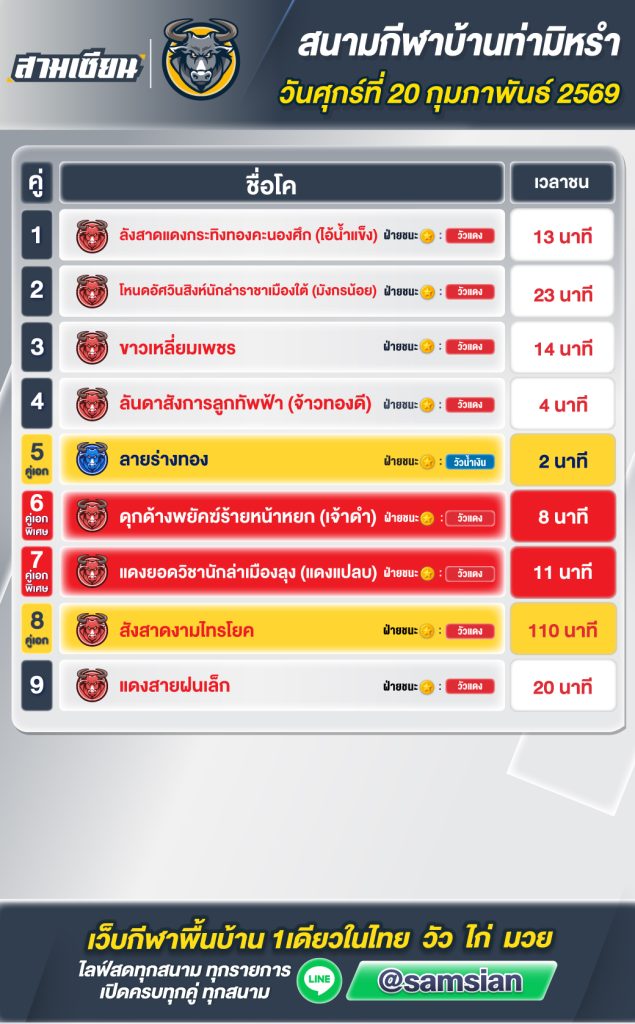 สรุปวัวชน สนามกีฬาชนโคท่ามิหร่ำ วันที่ 20 กุมภาพันธ์ 2569