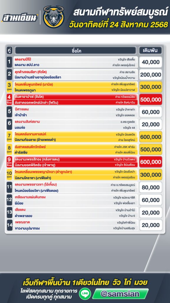 โปรแกรมวัวชน สนามกีฬาชนโคทรัพย์สมบูรณ์ วันที่ 24 สิงหาคม 2568