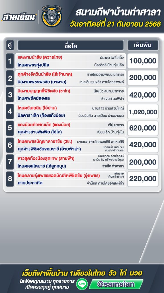 โปรแกรมวัวชน สนามกีฬาชนโคบ้านท่าศาลา วันที่ 21 กันยายน 2568