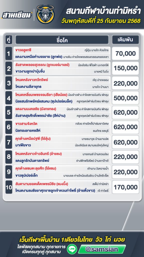 โปรแกรมวัวชน สนามกีฬาชนโคบ้านท่ามิหรำ วันที่ 25 กันยายน 2568