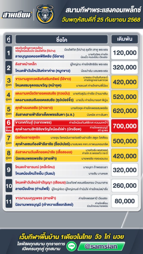 โปรแกรมวัวชน สนามกีฬาชนโคพระเเสงคอมเพล็กซ์ วันที่ 25 กันยายน 2568