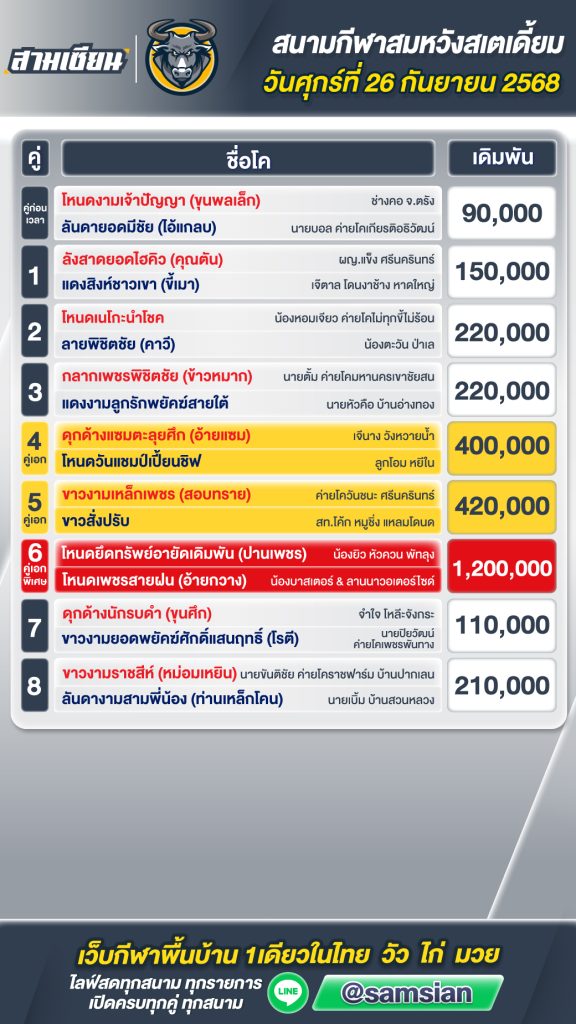 โปรแกรมวัวชน สนามกีฬาชนโคพระเเสงคอมเพล็กซ์ วันที่ 26 กันยายน 2568