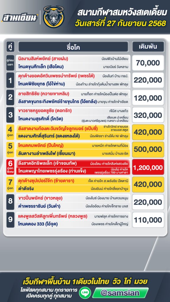 โปรแกรมวัวชน สนามกีฬาชนโคสมหวัง วันที่ 27 กันยายน 2568
