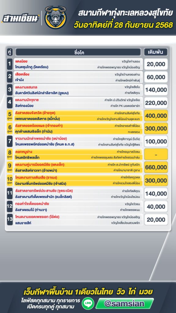 โปรแกรมวัวชน สนามกีฬาชนโคทุ่งทะเลหลวง วันที่ 28 กันยายน 2568