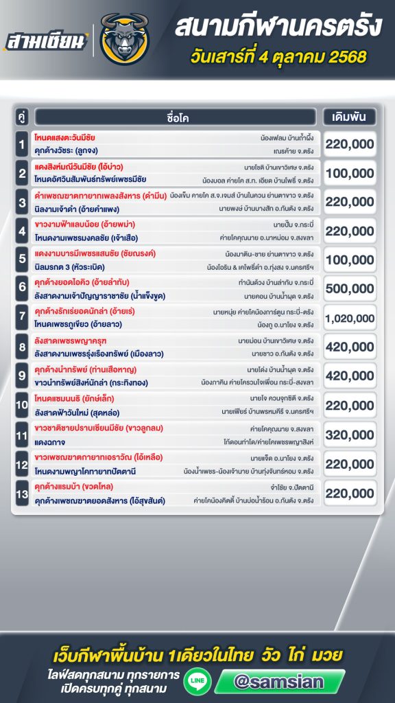 โปรแกรมวัวชน สนามกีฬาชนโคนครตรัง วันที่ 4 ตุลาคม 2568