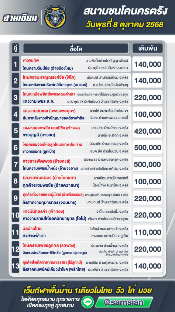 โปรแกรมวัวชน สนามกีฬาชนโคนครตรัง วันที่ 8 ตุลาคม 2568
