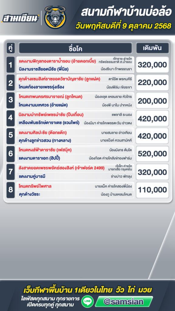 โปรแกรมวัวชน สนามกีฬาชนโคบ้านบ่อล้อ วันที่ 9 ตุลาคม 2568