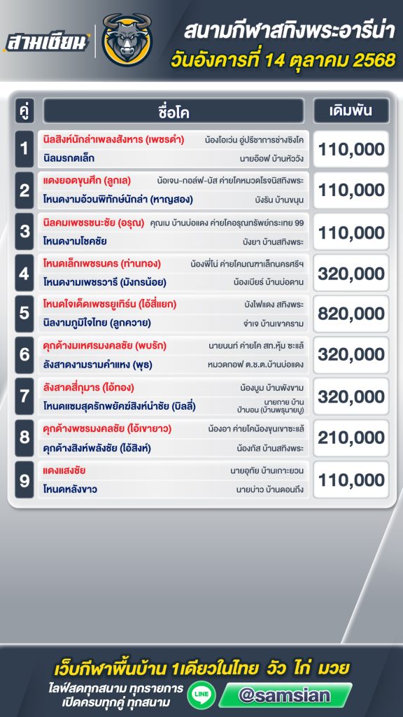 โปรแกรมวัวชน สนามกีฬาชนโคสทิงพระ วันที่ 14 ตุลาคม 2568