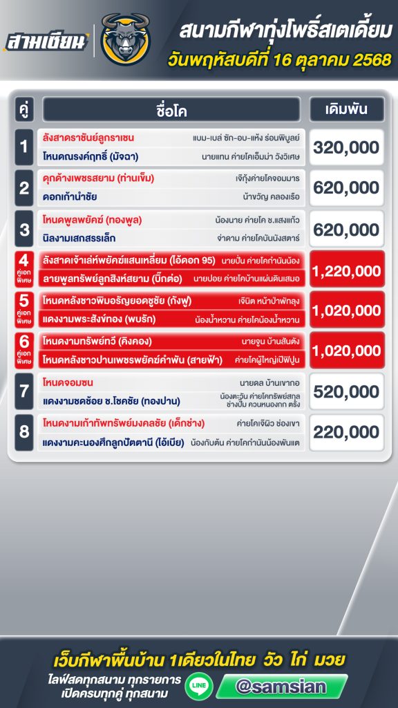 โปรแกรมวัวชน สนามกีฬาชนโคทุ่งโพธิ์ สเตเดี้ยม วันที่ 16 ตุลาคม 2568