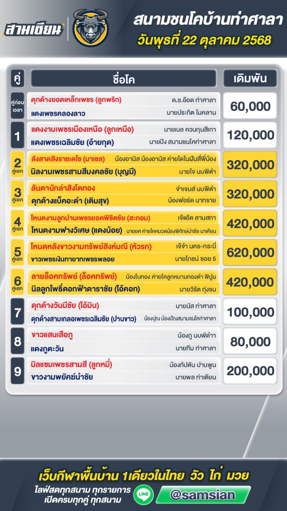 โปรแกรมวัวชน สนามกีฬาชนโคบ้านท่าศาลา วันที่ 22 ตุลาคม 2568