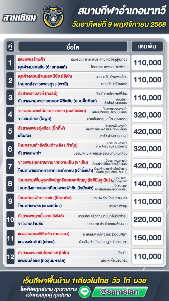 โปรแกรมวัวชน สนามกีฬาชนโคนาทวี วันที่ 9 พฤศจิกายน 2568