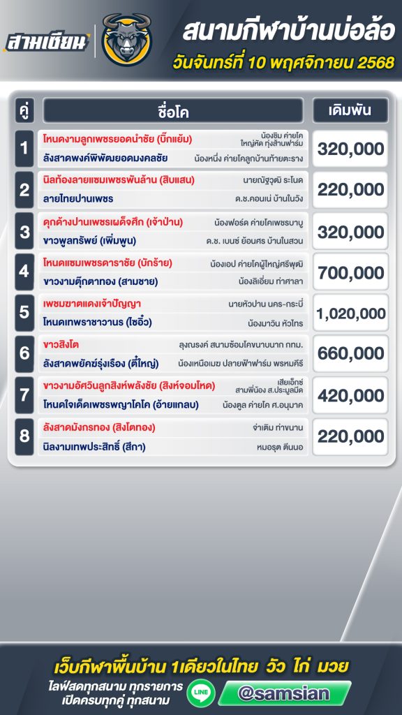 โปรแกรมวัวชน สนามกีฬาชนโคบ่อล้อ วันที่ 10 พฤศจิกายน 2568
