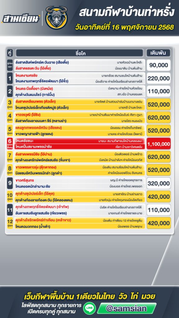 โปรแกรมวัวชน สนามกีฬาชนโคบ้านท่าหรั่ง วันที่ 16 พฤศจิกายน 2568