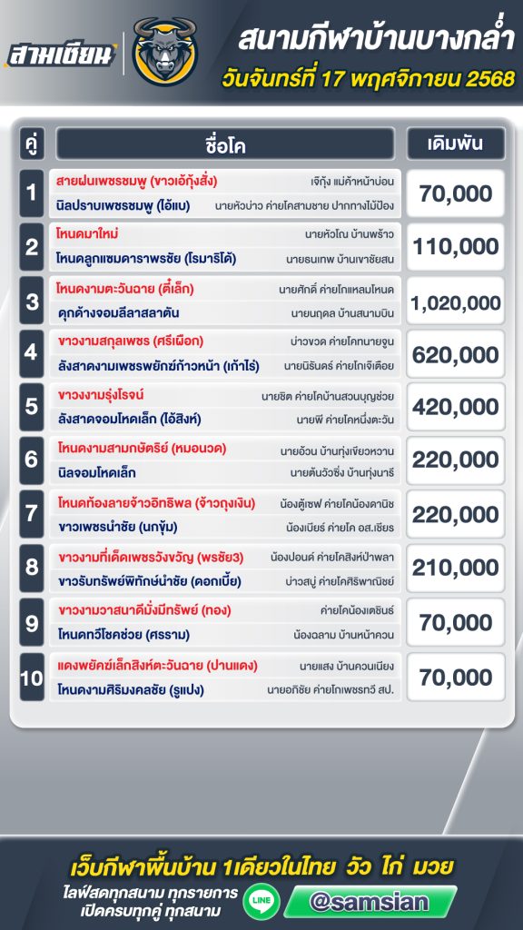 สรุปผล สนามชนโคบ้านบางกล่ำ วันที่17 พฤศจิกายน 2568