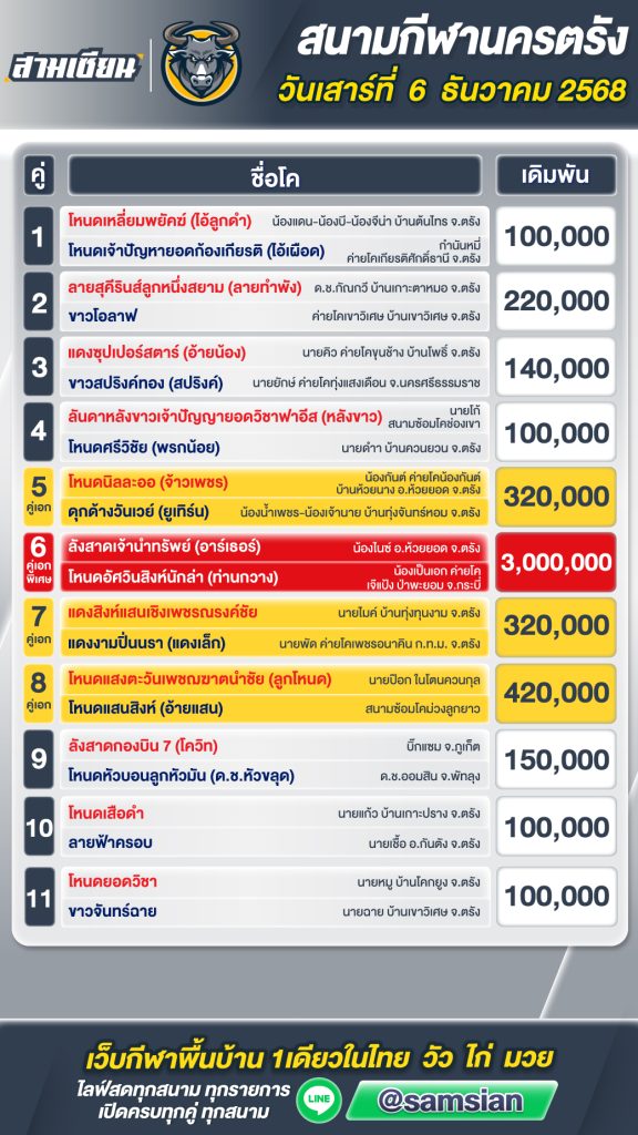 โปรแกรมวัวชน สนามกีฬาชนโคนครตรัง วันที่ 6 ธันวาคม 2568