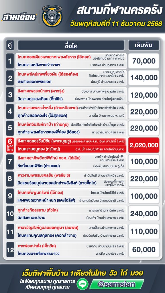 โปรแกรมวัวชน สนามกีฬาชนโคนครตรัง วันที่ 11 ธันวาคม 2568