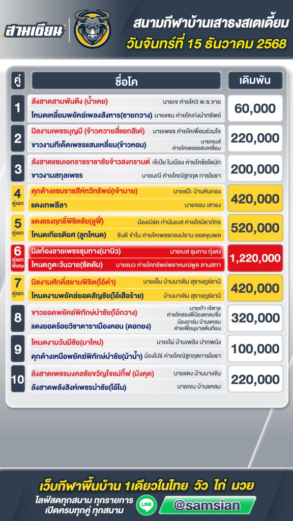 โปรแกรมวัวชน สนามกีฬาชนโคบ้านเสาธง วันที่ 15 ธันวาคม 2568