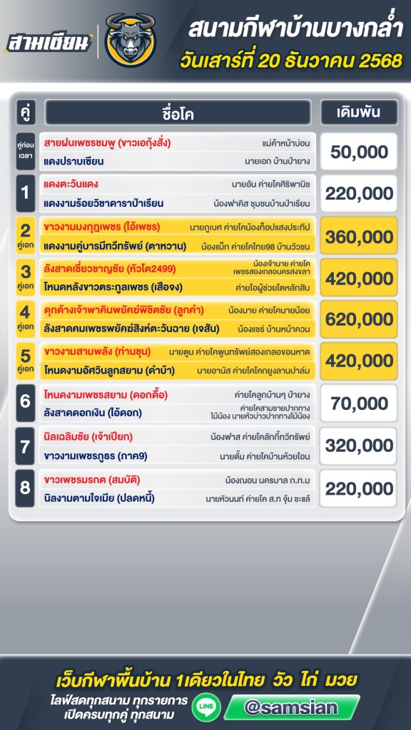 โปรแกรมวัวชน สนามกีฬาชนโคบางกล่ำ วันที่ 18 ธันวาคม 2568