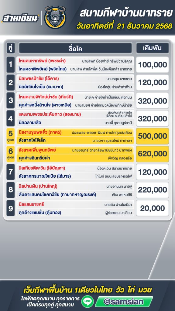 โปรแกรมวัวชน สนามกีฬาชนโคนาทราย วันที่ 21 ธันวาคม 2568
