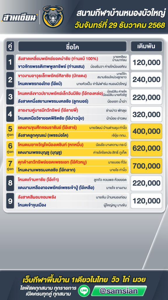 โปรแกรมวัวชน สนามกีฬาชนโคหนองบัวใหญ่ วันที่ 29 ธันวาคม 2568