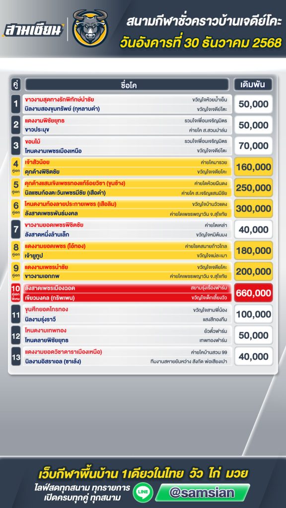 โปรแกรมวัวชน สนามกีฬาชนโคชั่วคราวเจดีย์โค๊ะ วันที่30 ธันวาคม 2568