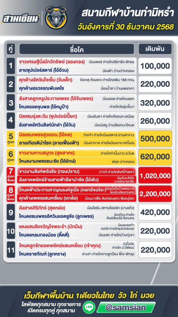 โปรแกรมวัวชน สนามกีฬาชนโคท่ามิหรำ วันที่30 ธันวาคม 2568