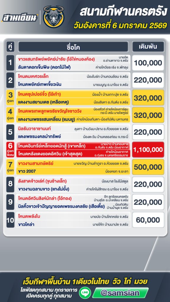โปรแกรมวัวชน สนามกีฬาชนโคนครตรัง วันที่6 มกราคม 2569